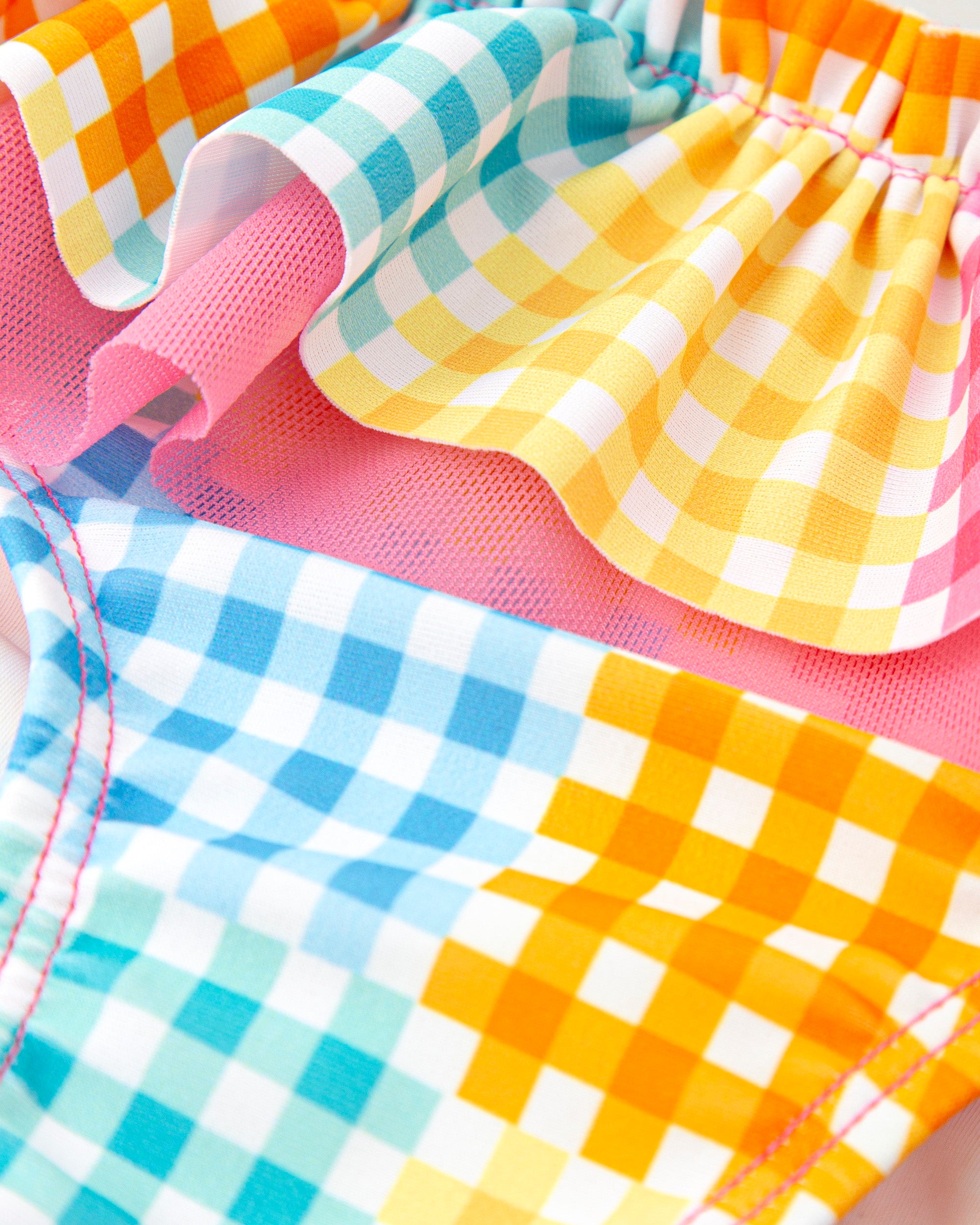 Colorful gingham panty with a ruffle at the top. Sizes range from 6M to 8A. These garments are not resistant to bleach or other chlorine bleach. Machine washable, but not exceeding 30°C. These garments are not ironable. This garment cannot be dry cleaned. Like all our garments, it has the AITEX quality certificate. COMPOSITION: PANTY: OUTER: POLYAMIDE 90% ELASTANE 10% LINING: POLYAMIDE 93% ELASTANE 7%