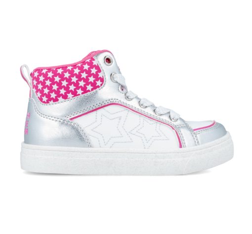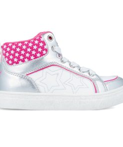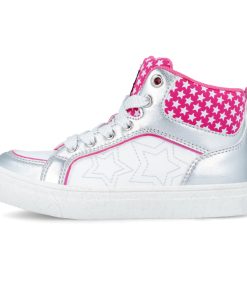 White and silver ankle boot with a fuchsia upper and white stars, matching laces. Side zipper closure. Sizes range from 28 to 36.