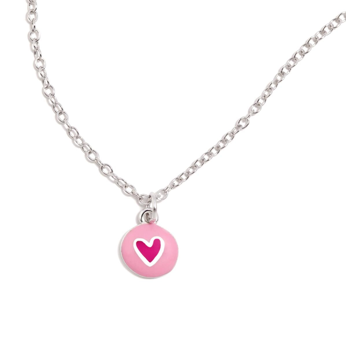 Round pink pendant with a fuchsia heart made of rhodium-plated sterling silver and enamel. It comes with an extension chain. COLLECTION: RAINBOW. Earrings: For hygiene reasons, returns are only accepted for broken or factory-defective items.