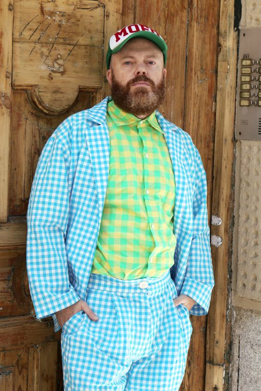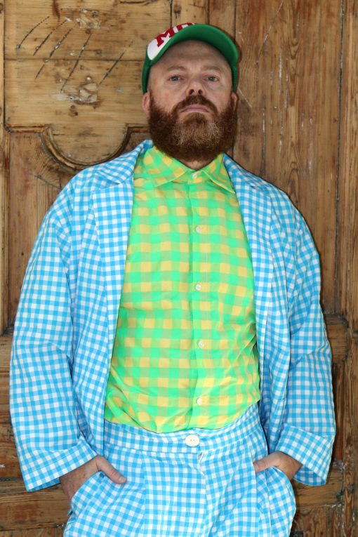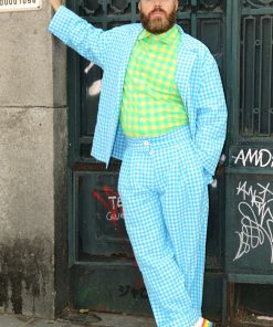 Blue gingham blazer, buttonless. Large size. Two sizes: S/M – L/XL. Machine wash max 30°C. Do not bleach. Do not tumble dry. Iron inside out, max 90°C. COMPOSITION: 92% POLYESTER 8% POLYURETHANE.