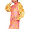Two-tone orange/yellow pencil skirt with a print of hearts and flowers, elastic waistband. Sizes from 36 to 44. Machine wash at a maximum temperature of 30°C. Do not bleach. Do not tumble dry. Iron at a maximum temperature of 110°C. 95% polyester, 5% spandex.